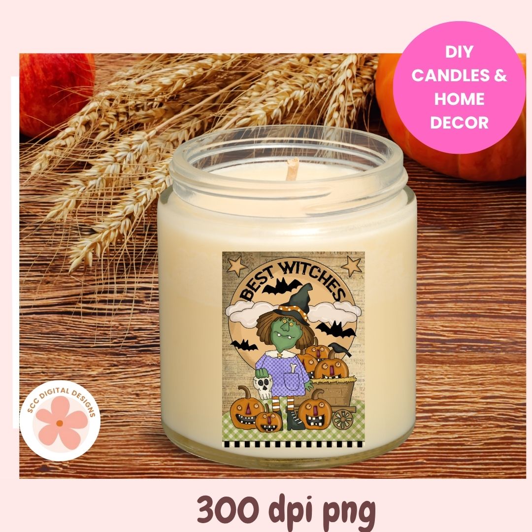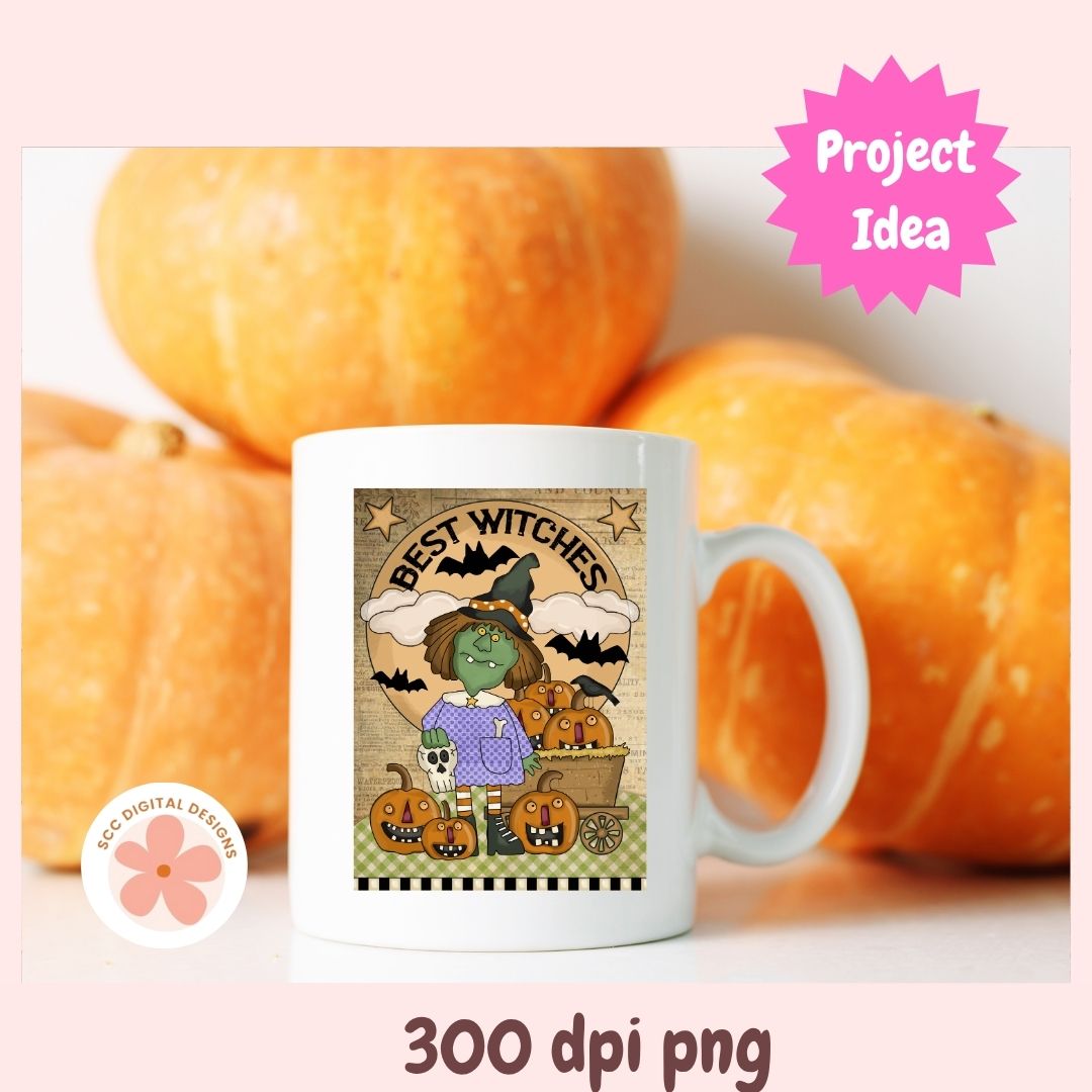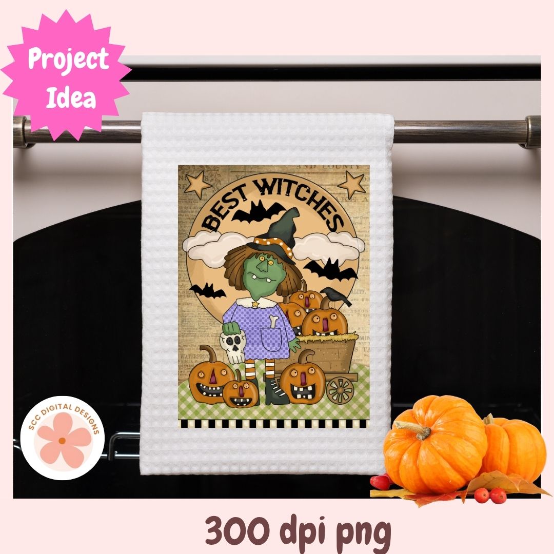 Bring a touch of vintage charm to your Halloween projects with this Best Witches Primitive Folk Art Clipart! Featuring a whimsical green witch, happy pumpkins, bats, and rustic paper textures, this design perfectly captures the spirit of old-fashioned Halloween fun.