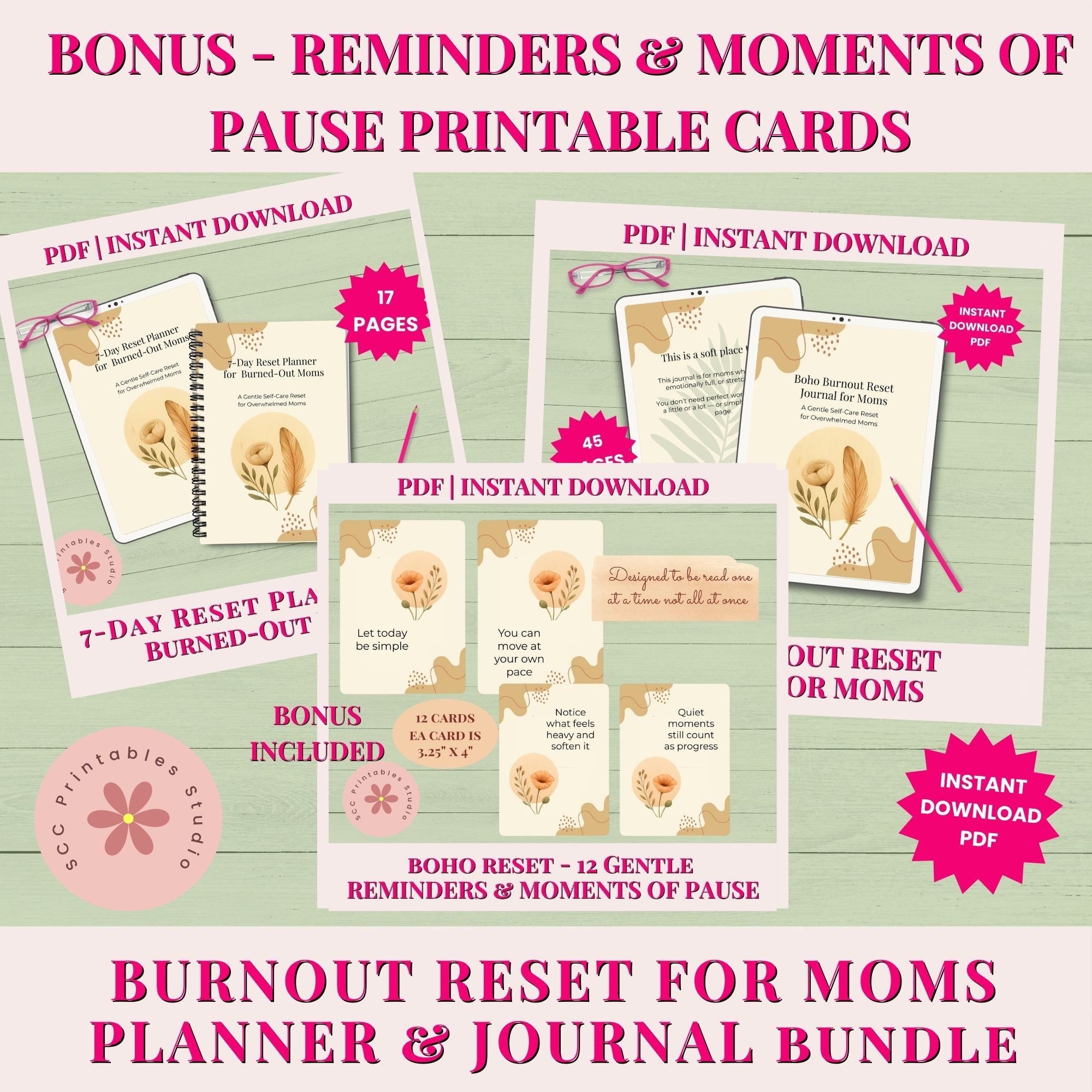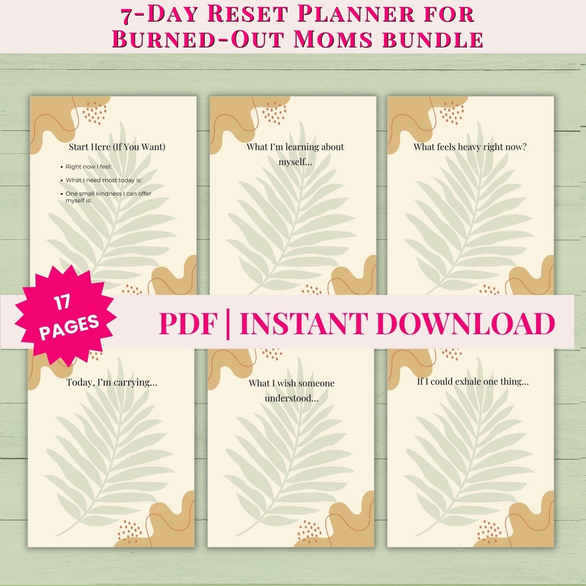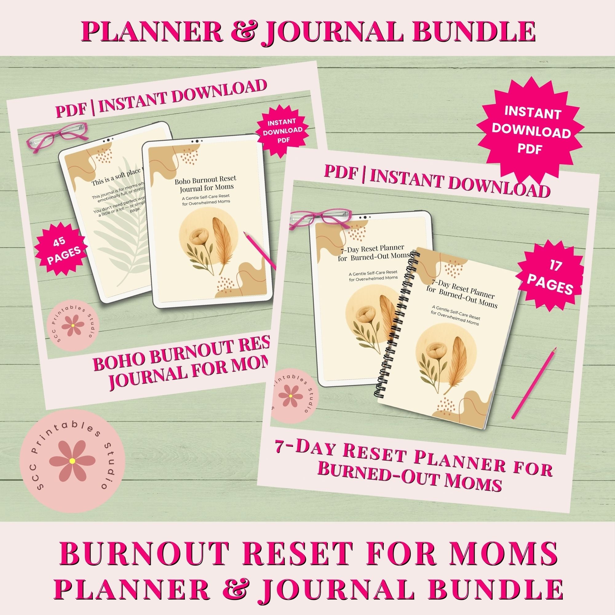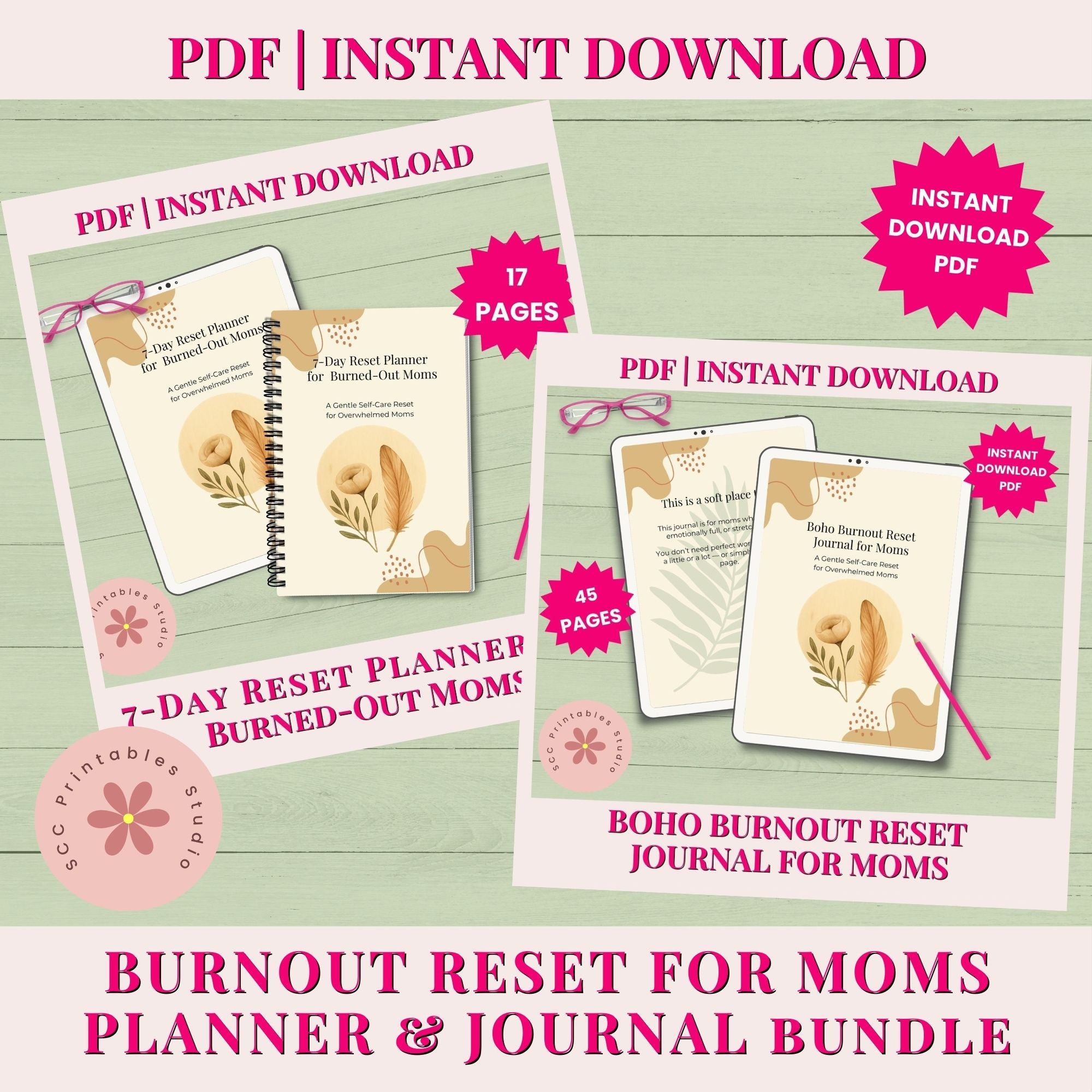 Boho Burnout Reset Bundle for Moms - 7-Day Reset Planner & Gentle Self-Care Journal Printable Mindset & Recovery Ebook for Mom