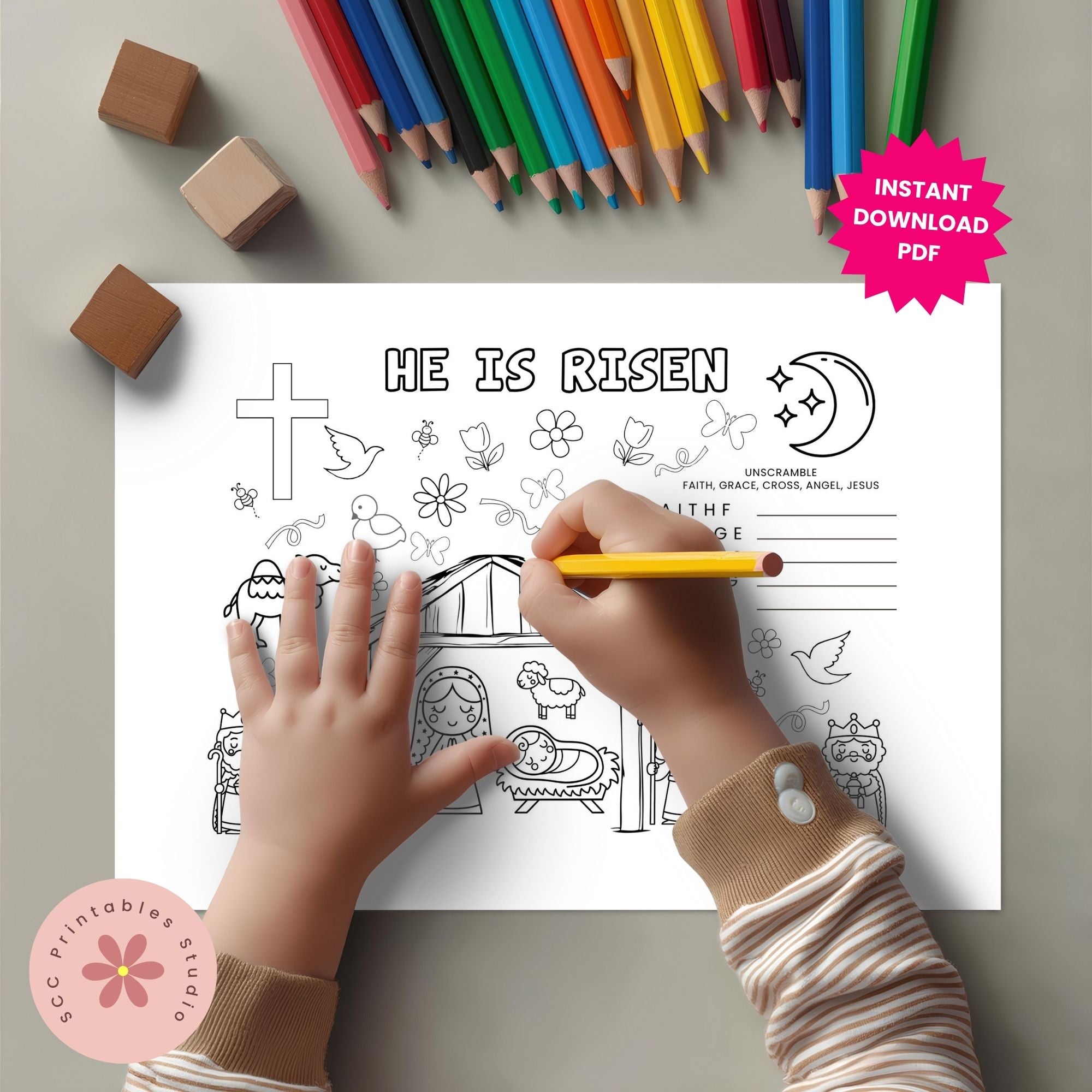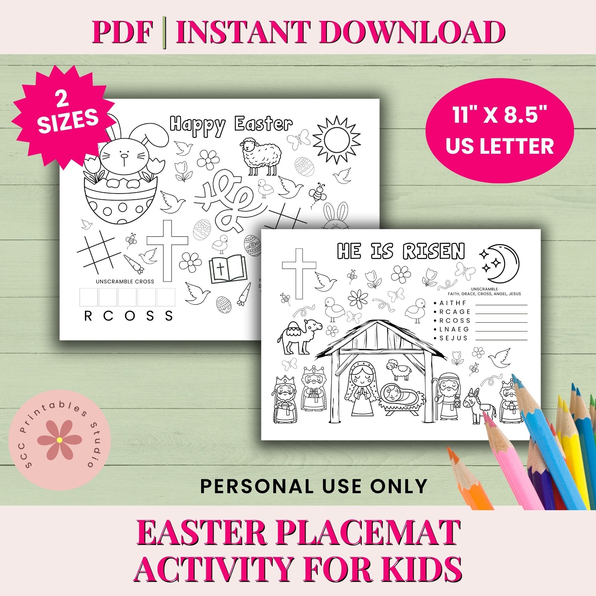 Our Easter Activity Placemat is an activity worksheet designed to engage kids in meaningful religious learning about Easter and the Nativity. It features fun puzzles, coloring sections, and educational prompts to deepen their understanding of Easter's significance.
