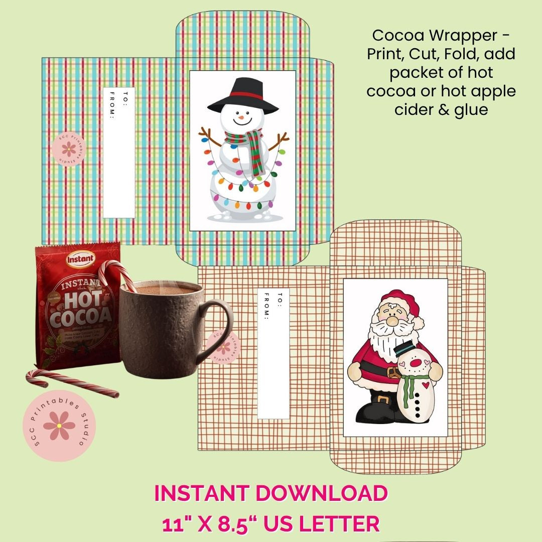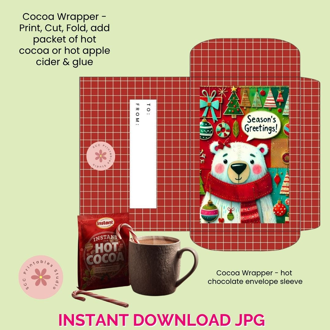 Christmas Cocoa Wrapper Printable, Santa Snowman Polar Bear Gift Card Sleeve, DIY Hot Chocolate Packet Envelope