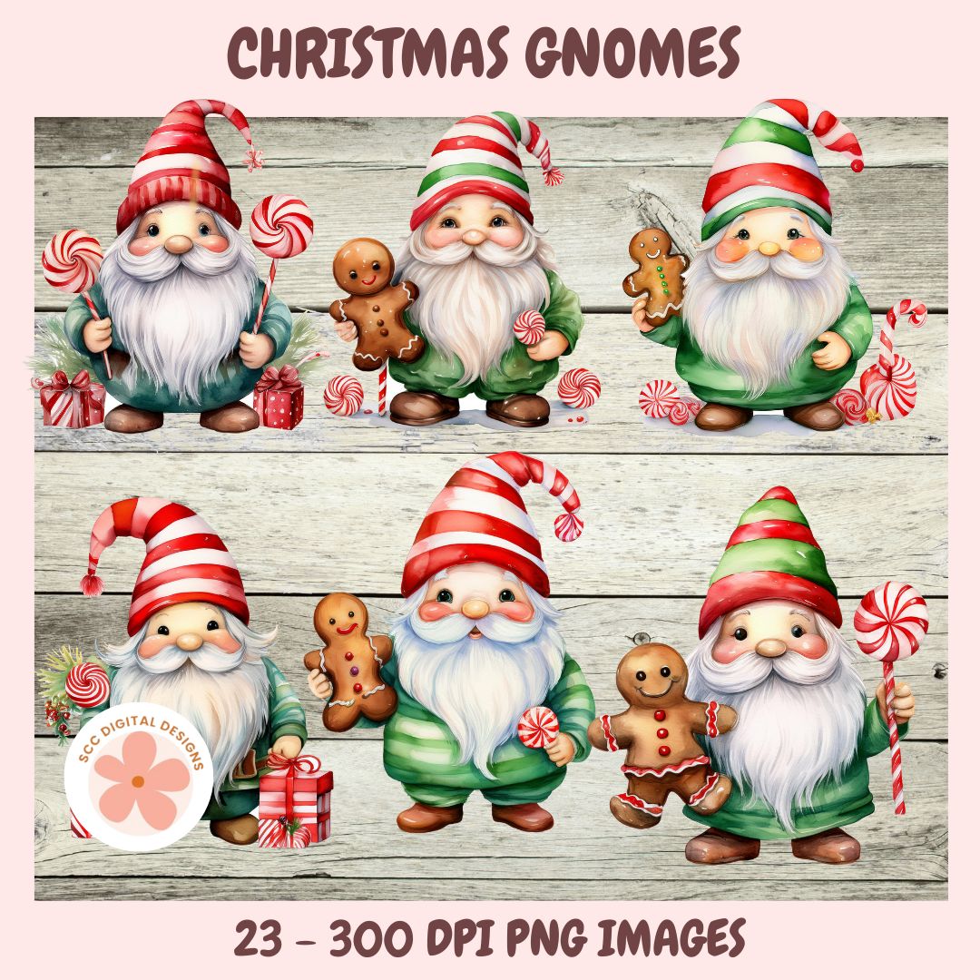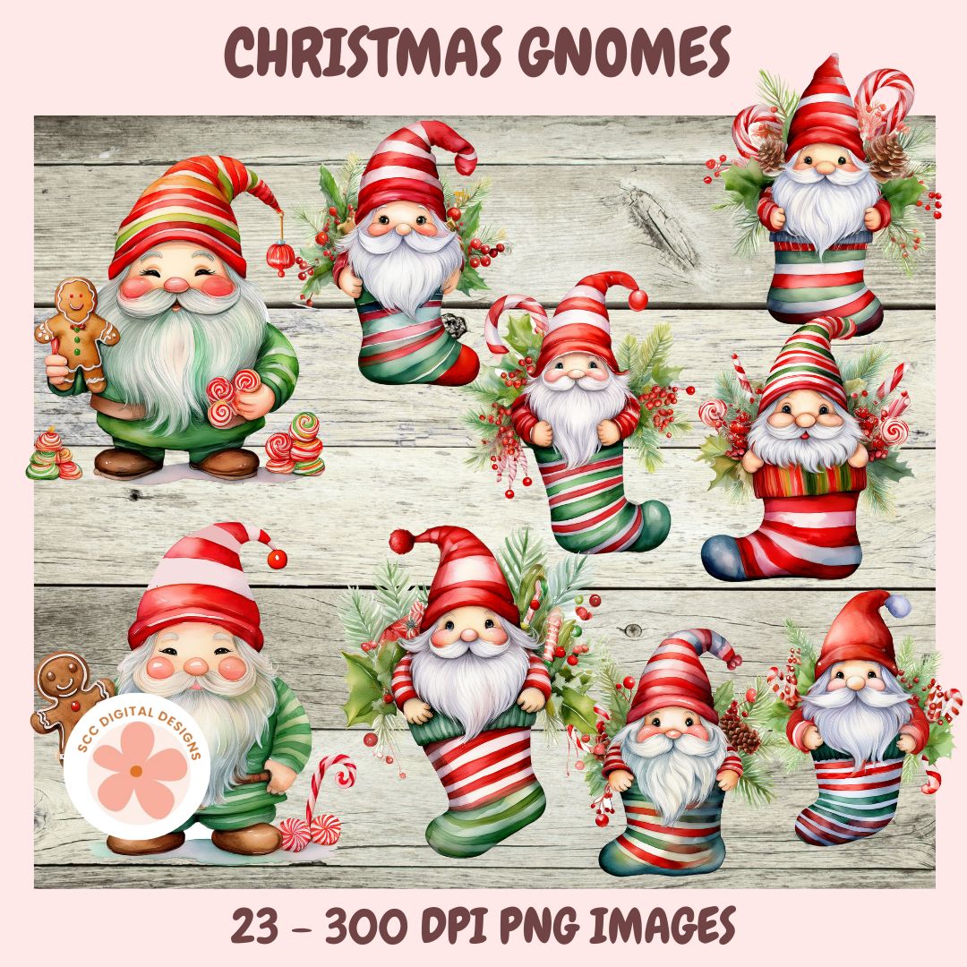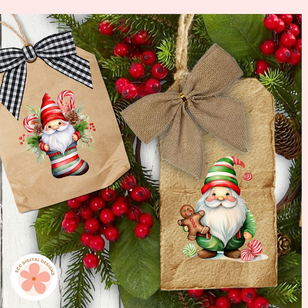 Christmas Gnomes Clipart Bundle, Whimsical Santa Gnomes, Gingerbread Cookies, Stockings & Candy Cane PNGs for DIY Crafts, Stickers & Scrapbooking