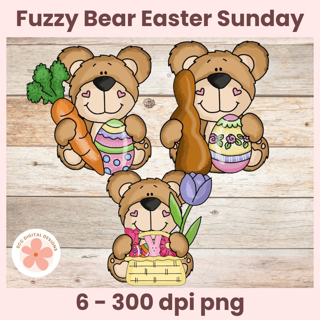 Our adorable Fuzzy Bear clipart features whimsical teddy bears holding a cute Easter basket, and pastel colored eggs, chocolate bunny & a Bible.