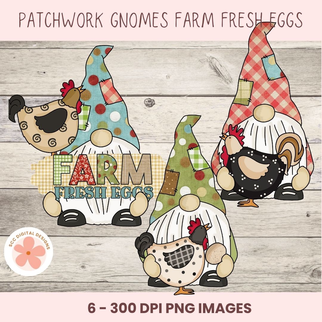 This adorable clip art set features whimsical patchwork gnomes with colorful chickens & farm fresh eggs signs.