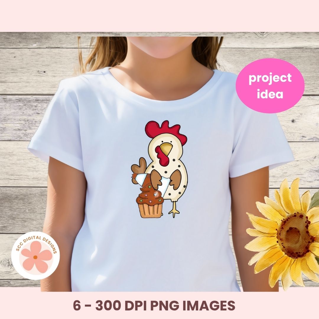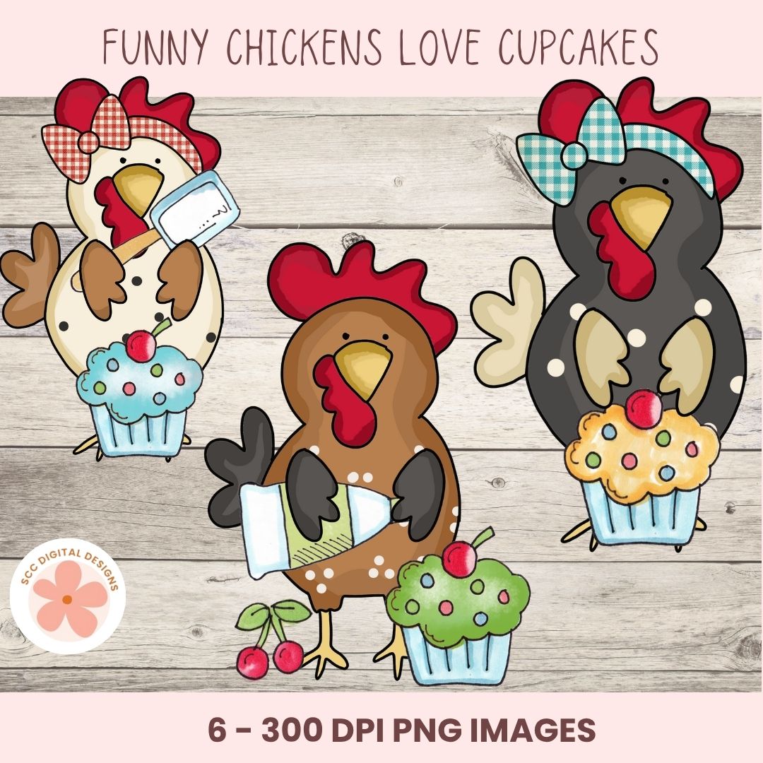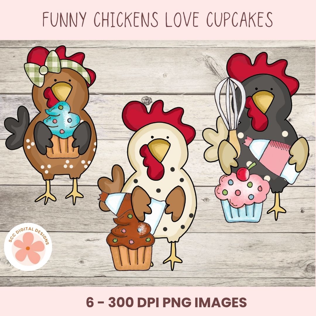 Funny Chicken Clipart PNG, Whimsical Cartoon Chickens with Birthday Cupcakes, Funky Farm Chicken Clip Art for T-Shirts, Stickers, Farmhouse Wall Art & Paper Crafting