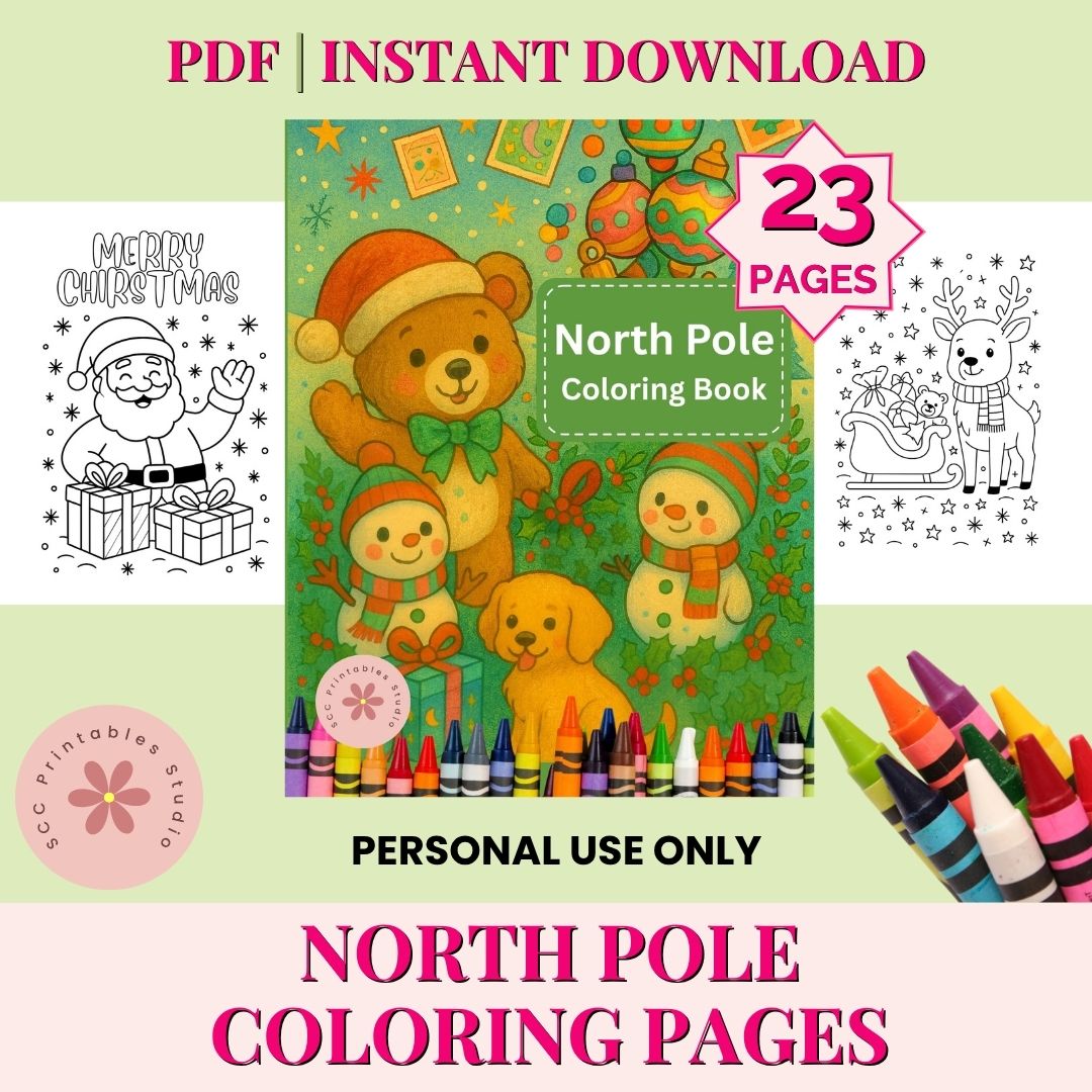 North Pole Christmas Coloring Pages, Santa & Mrs. Claus, Reindeer, Snowmen Printable Holiday Coloring Book for Kids & Adults