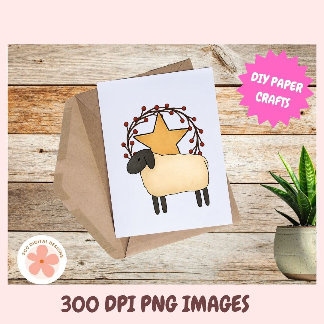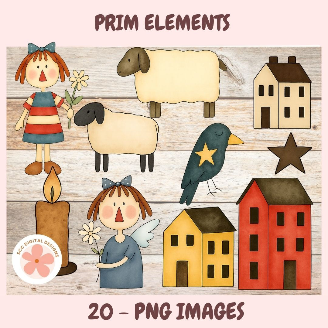 Our Prim Elements clipart bundle features saltbox houses, whimsical sheep, primitive annies, crows, and a flag! This collection of perfect for digital and printable stickers, scrapbooking, and more.