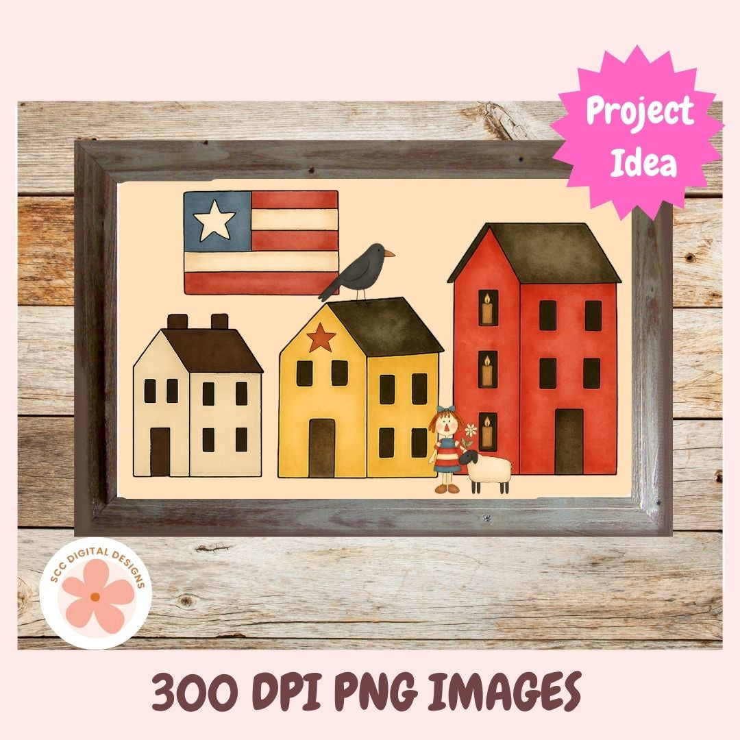 Primitive Americana PNG Clipart Bundle – Saltbox Houses, Sheep, Annie Dolls, Crow & Flag Folk Art Elements for Stickers, Scrapbooking & Crafting