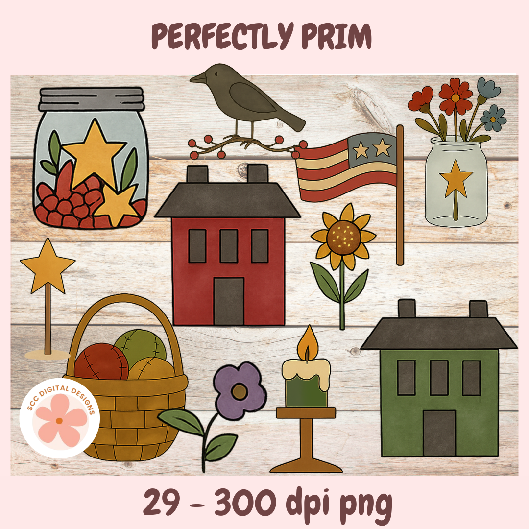 Primitive Country Folk Art Clipart Bundle – Saltbox Houses, Sheep, Crow, Flag & Floral PNG Graphics for Stickers, Junk Journals & Crafting