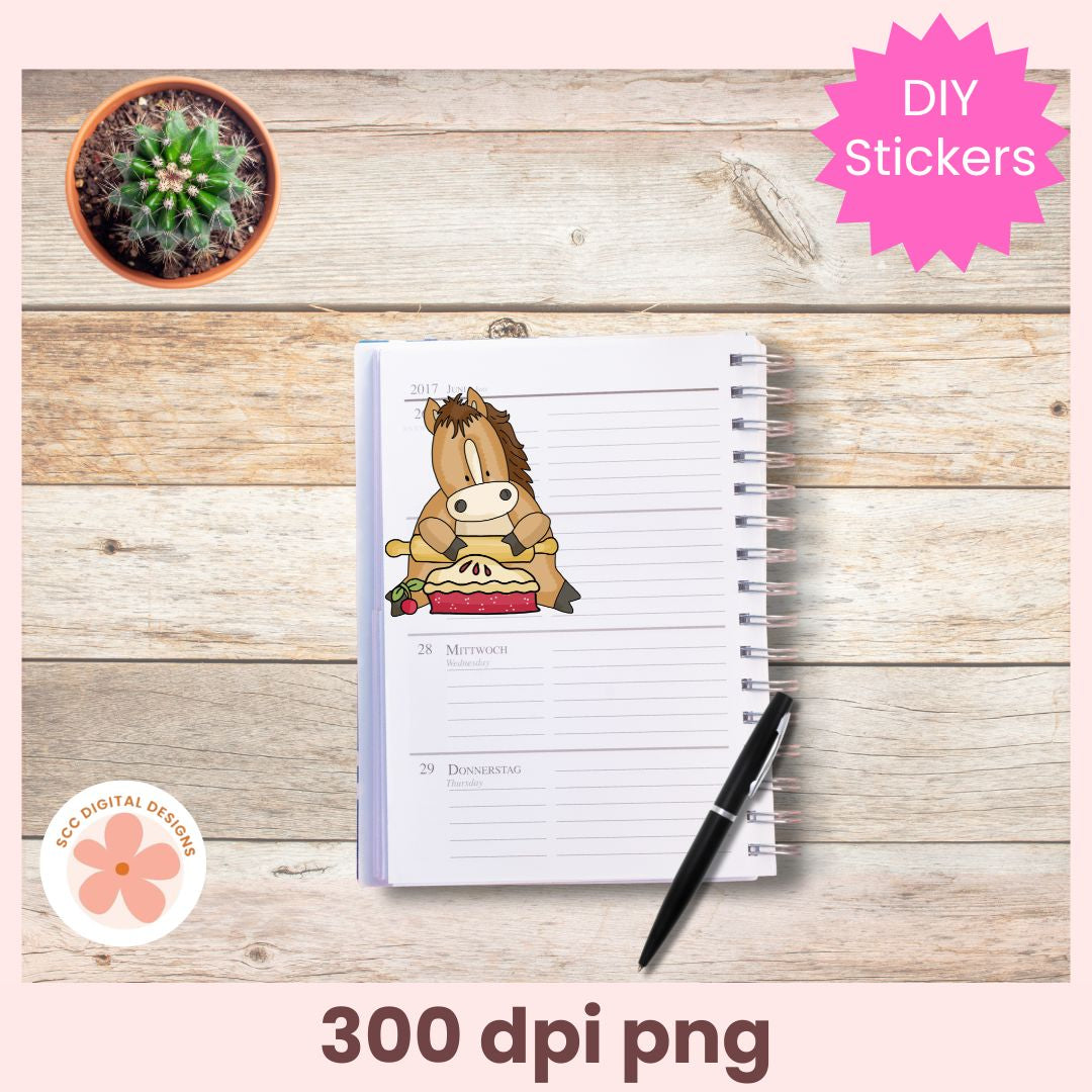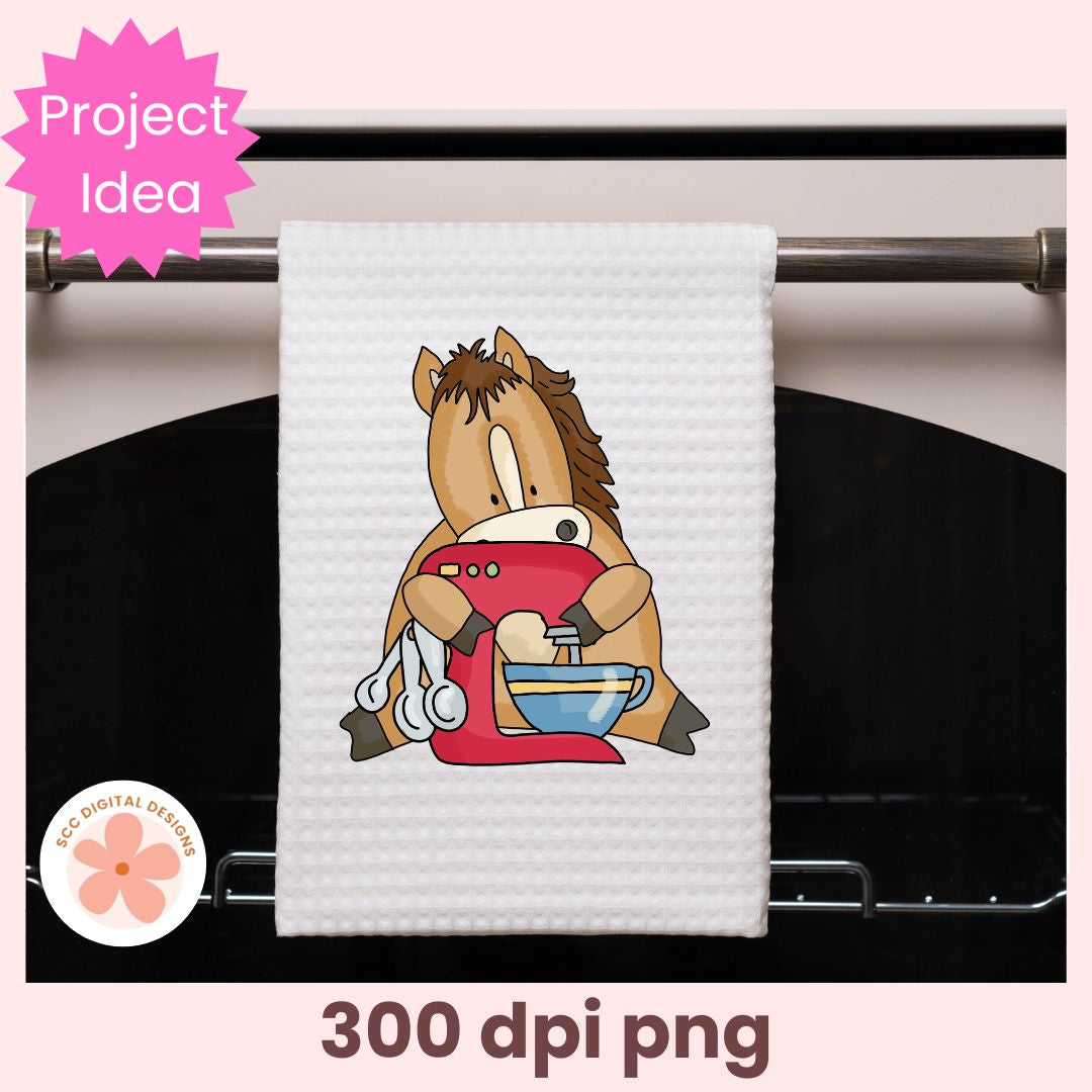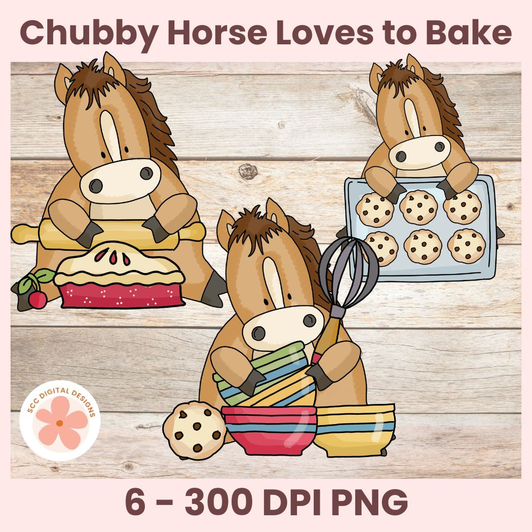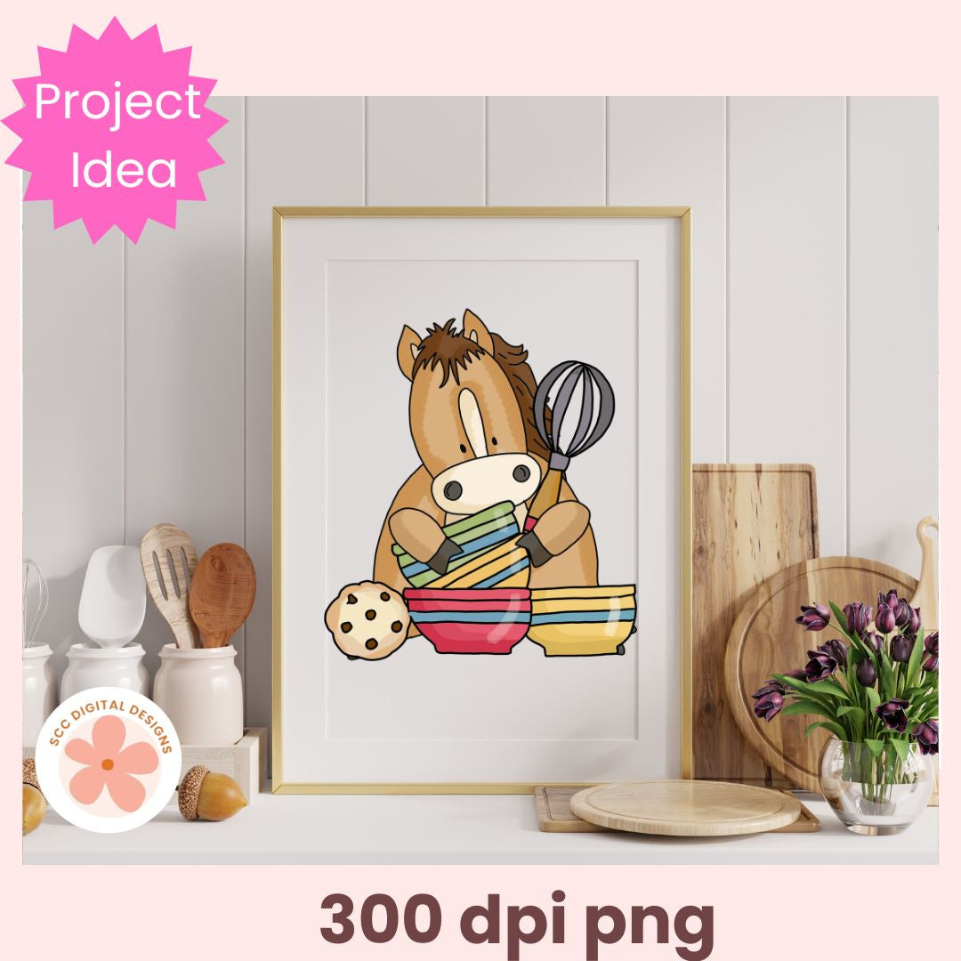 Our Whimsical Horse Clipart collection features cute cartoon horses baking pies & cookies. Each graphic png is designed with vibrant colors and playful details, making it ideal for all farm animal enthusiasts.